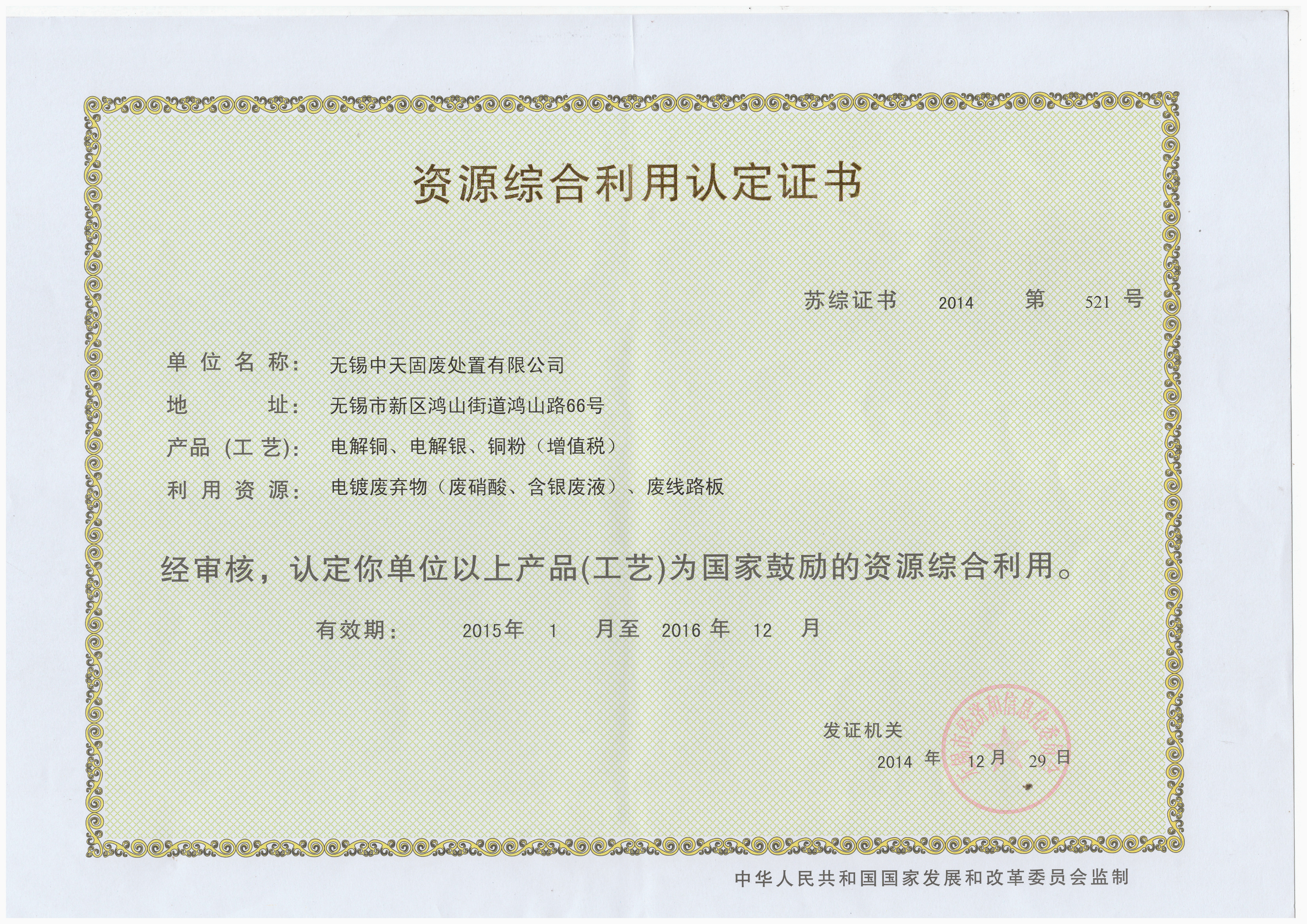 资源综合利用认定证书