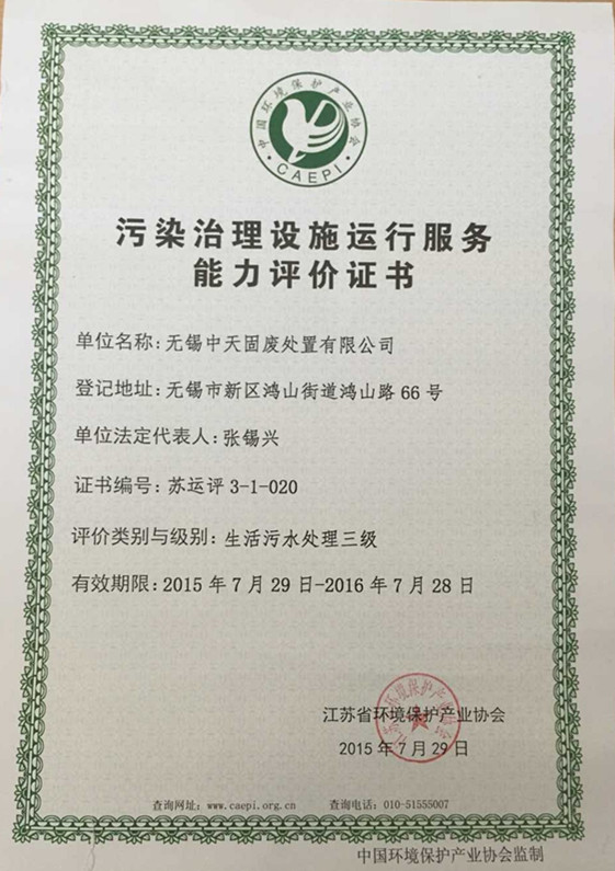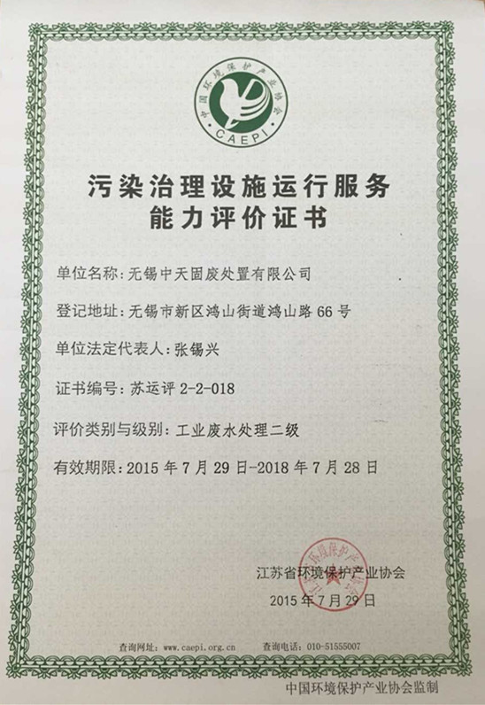 污染治理设施运行服务能力评价证书