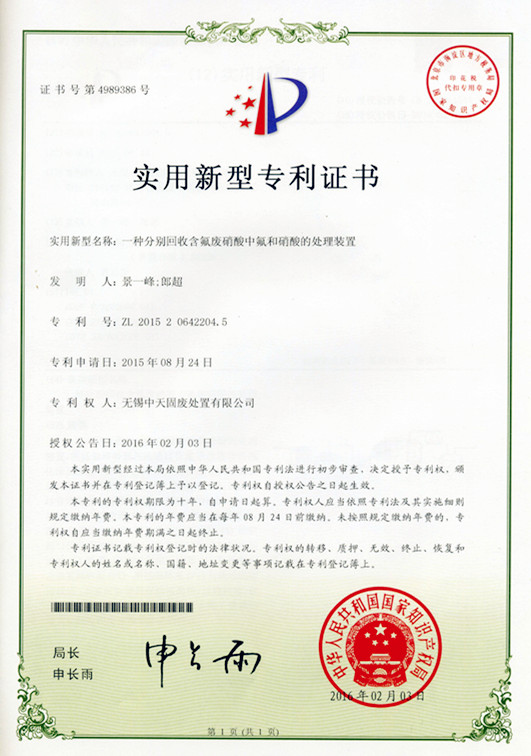 摘要:一种分别回收含氟废硝酸中氟和硝酸的处理装置 发明人:景一峰 郎超...
