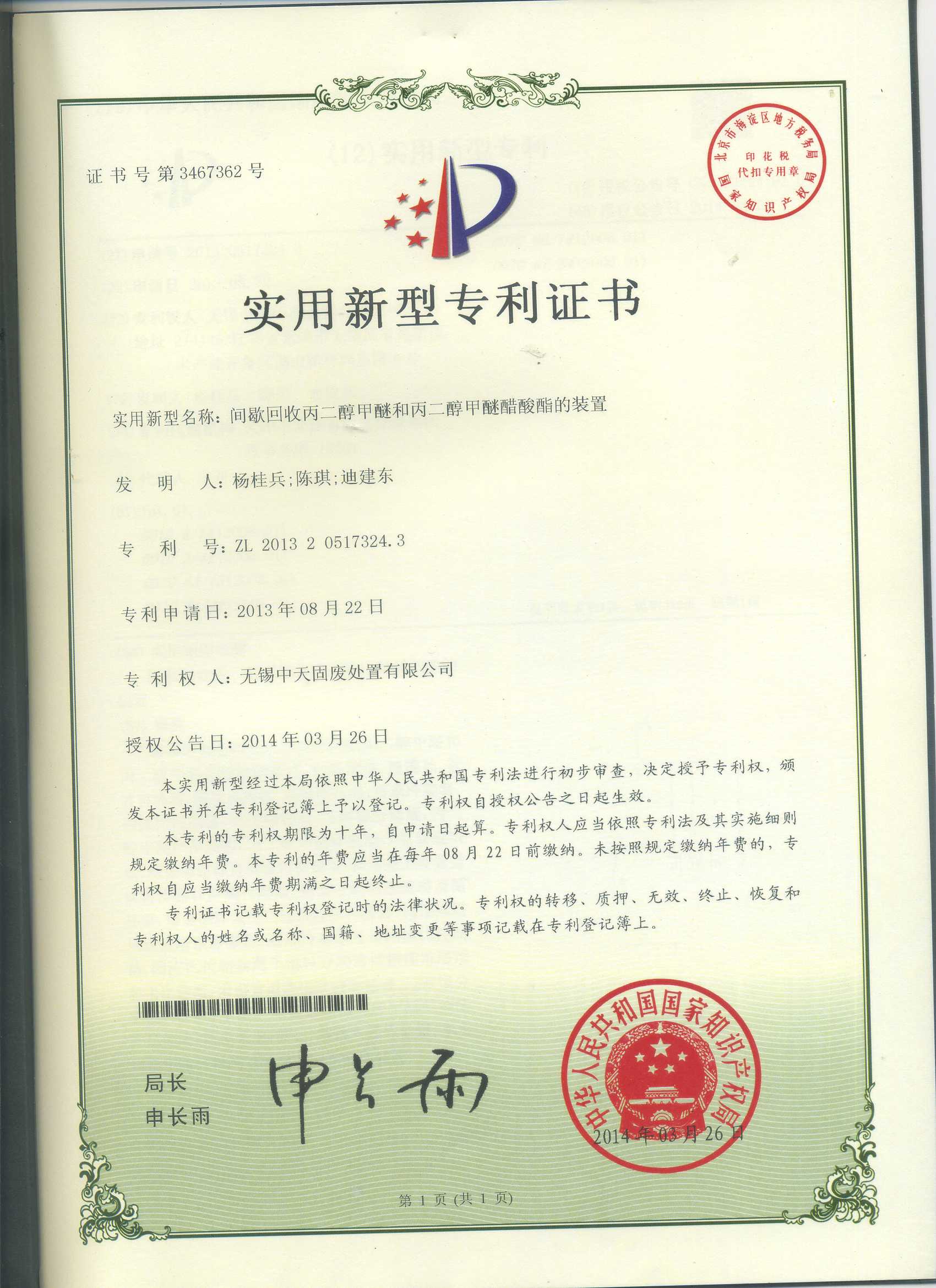 摘要:间歇回收丙二醇甲醚和丙二醇甲醚醋酸酯的装置 发明人:杨桂兵、陈琪、迪建东...