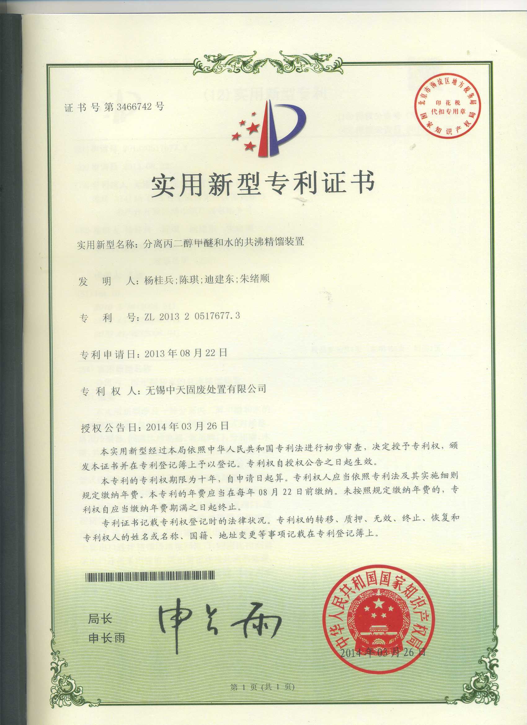 摘要:分离丙二醇甲醚和水的共沸精馏装置 发明人:杨桂兵、陈琪、迪建东...